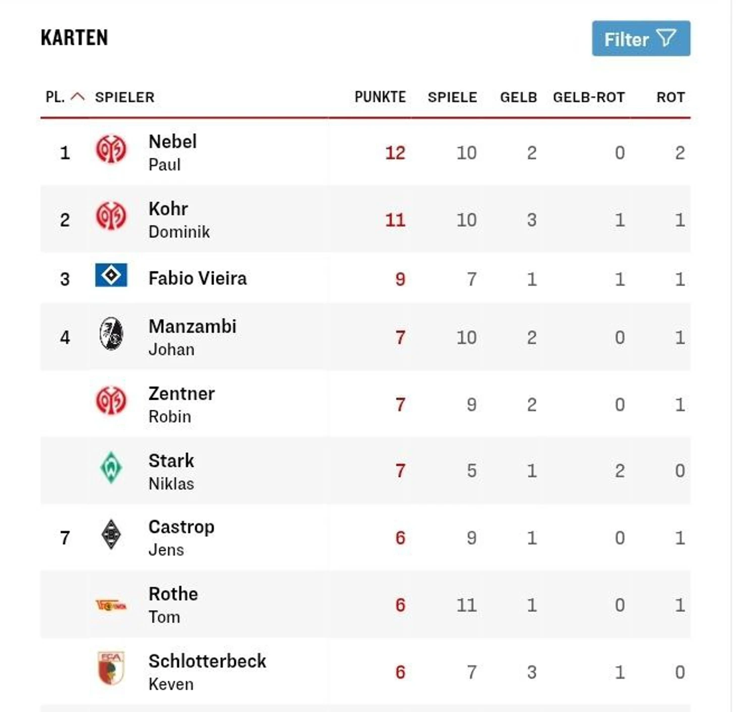 *игрок – кол-во игр – желтые – 1+1 желтые – красные – всего