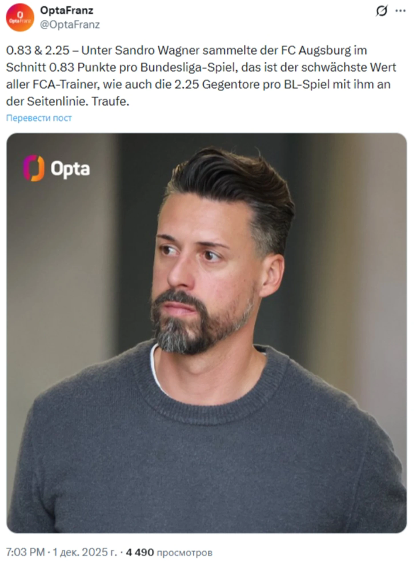 Команда оказалась на 14-м месте в Бундеслиге и с Сандро Вагнер в итоге контракт расторгли, до зимней паузы исполняющим обязанности назначен Мануэль Баум.