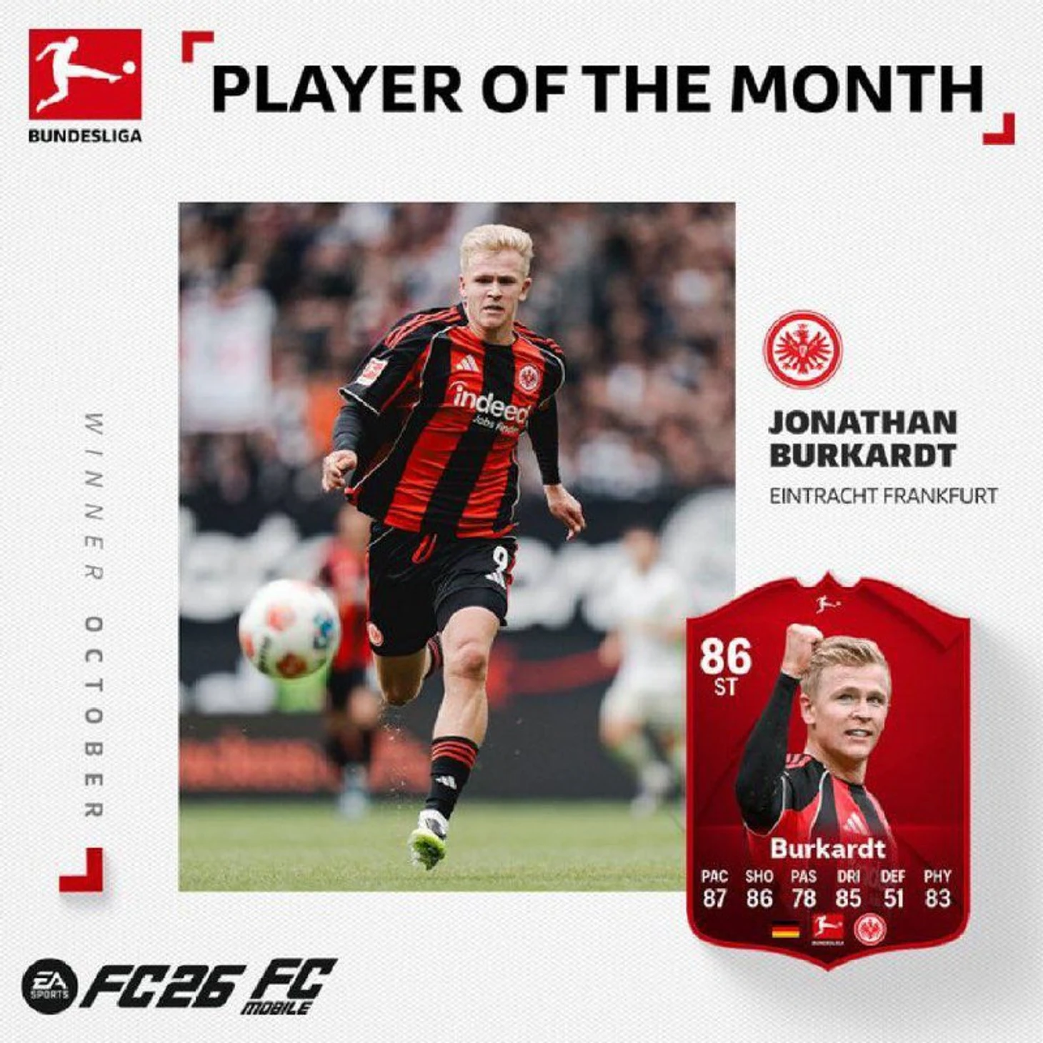 Йонатан Буркардт был признан лучшим игроком октября в Бундеслиге, опередив таких соперников, как Кристоф Баумгартнер («РБ Лейпциг»), Алехандро Гримальдо («Байер») и трио игроков «Баварии» – Луиса Диаса, Йошуа Киммиха и Михаэля Олисе.