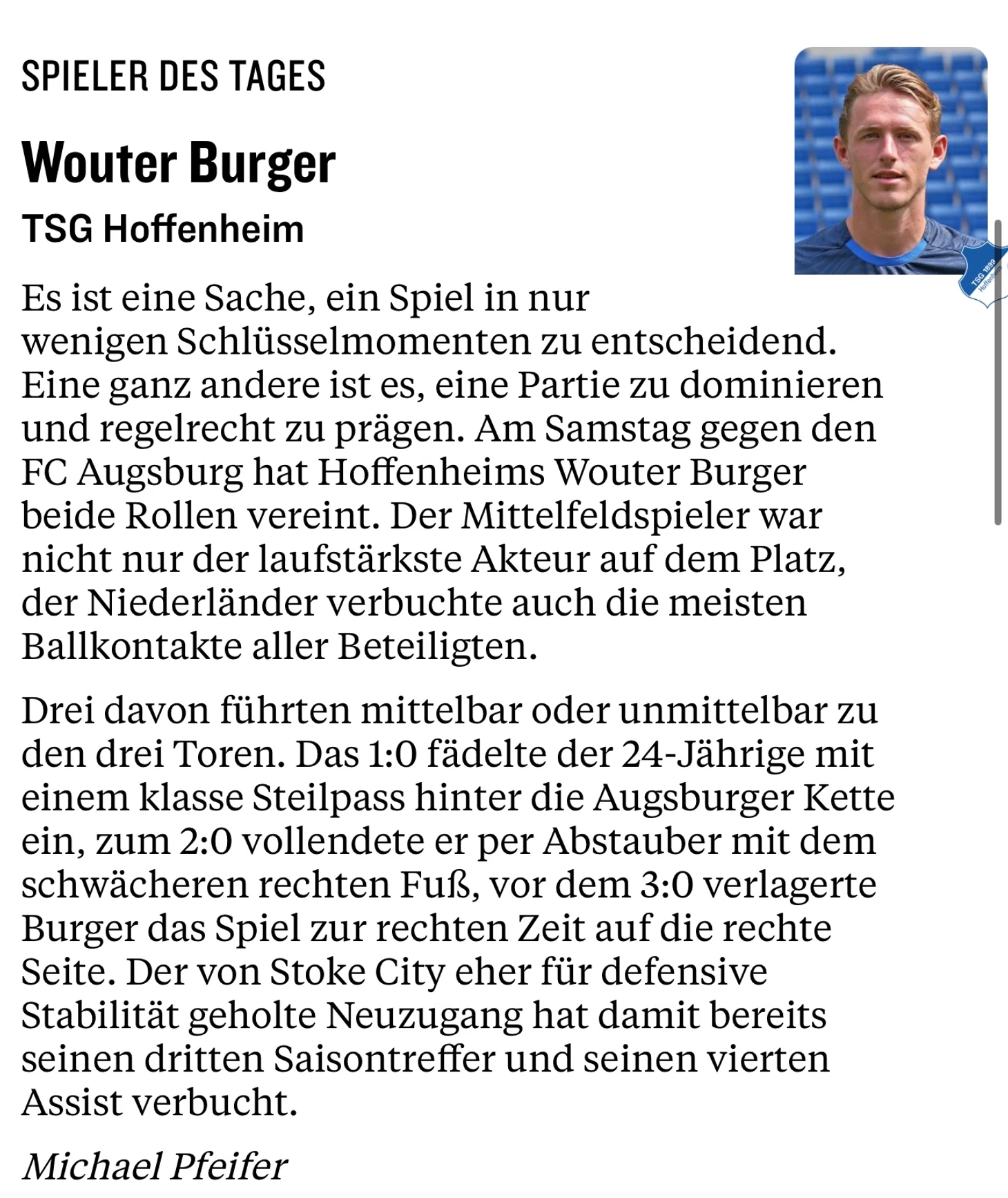 времени на это не дали. Кризисный «Аугсбург» не показал ничего против «деревенских», хозяева установили итоговый счет 3:0 еще в первом тайме. У Бургера 1+1 по «гол+пас», а у «Аугсбурга» – автогол и последующее увольнение главного тренера.