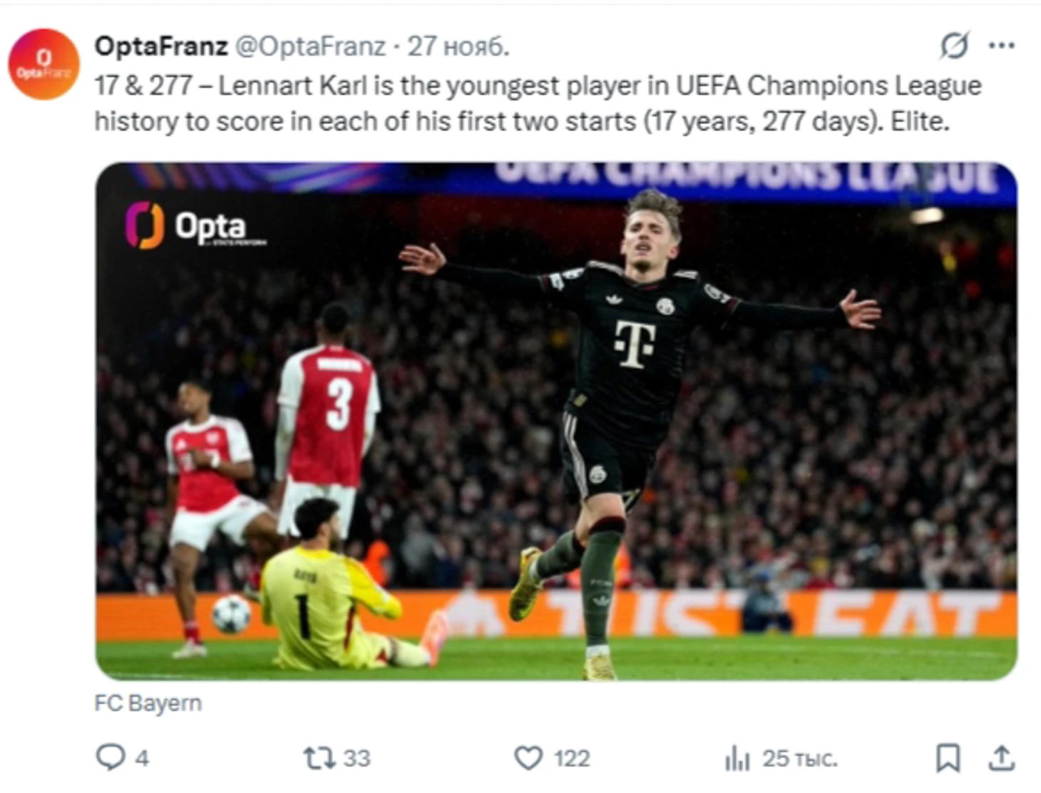 Тяжелейший выезд в Лондон к «Арсеналу» в ЛЧ закончился для «Баварии» и вовсе неудачно. Первое поражение в сезоне 1:3 от Артеты и компании. «Арсенал» действительно выглядел на голову сильнее и увереннее, особенно во втором тайме. У мюнхенцев единственный мяч забил юный Ленарт Карл.