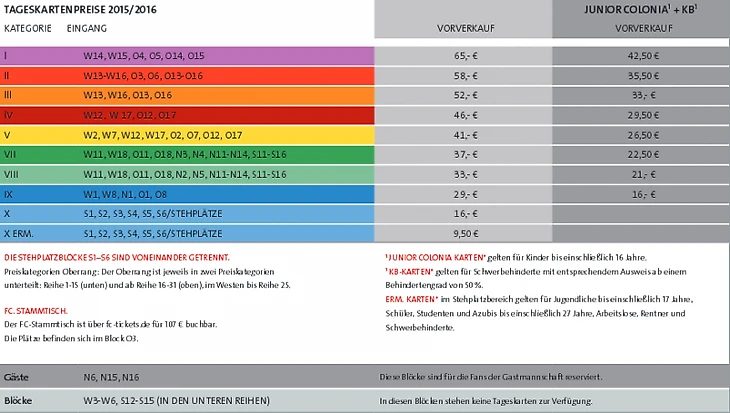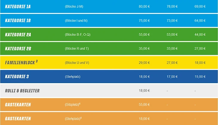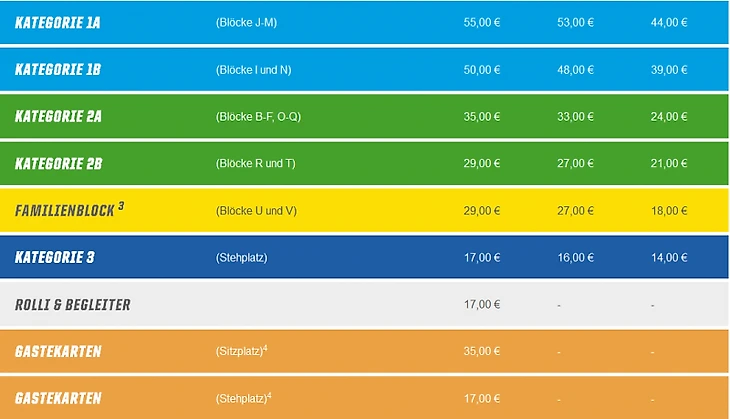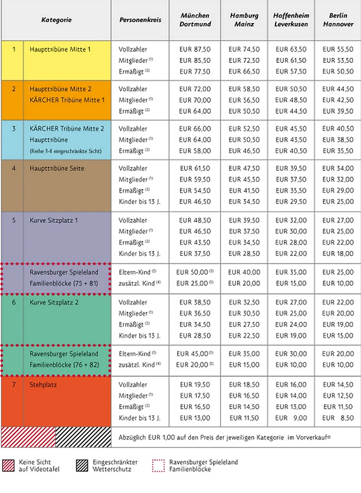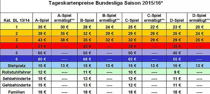 Цены на билеты делились на 4 категории от D-spiel (самые не привлекательные для зрителя) до A-spiel (самые зрелищные, например, игры с «Баварией» или дортмундской «Боруссией»). Кроме того, были в продаже и семейные пакеты, а также предложения для лиц с ограниченными возможностями. Цена на эти предложения была постоянной на все матчи.