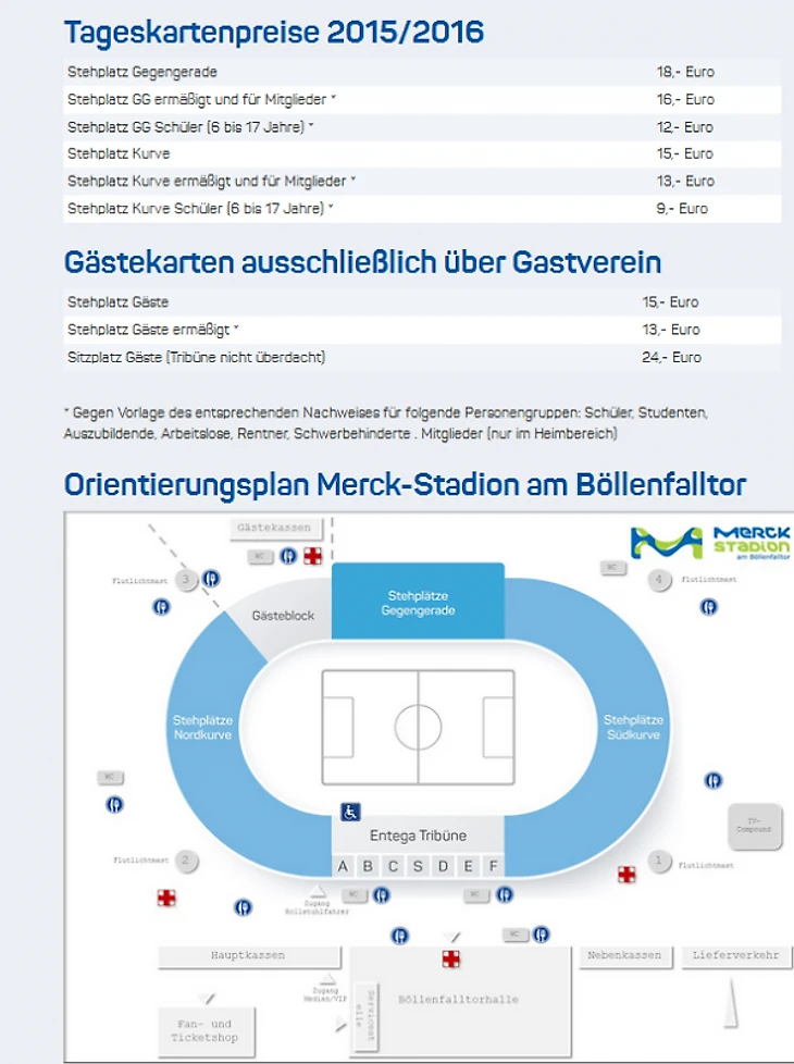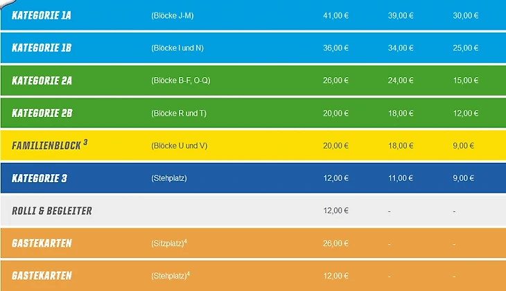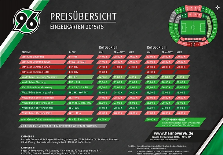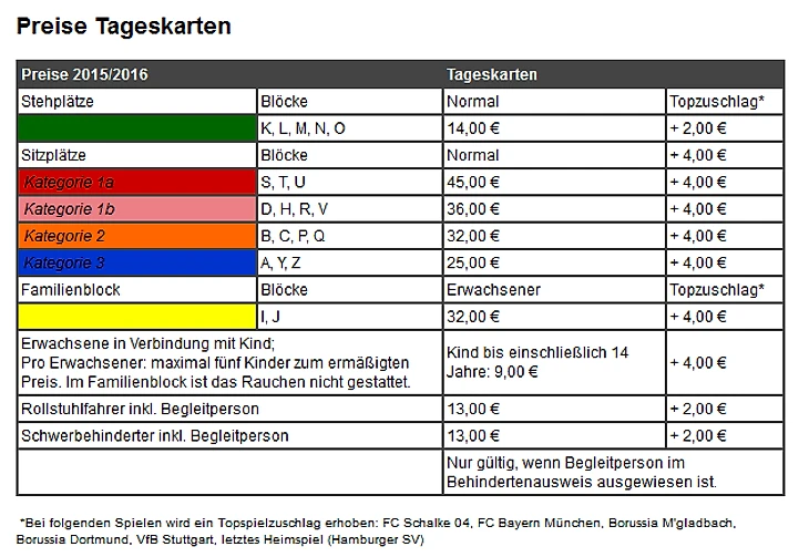 Итак, первая команда, которая прощается с Бундеслигой. Сезон для нее выдался очень трудным, особенно это связано с постоянными весьма странными решениями руководства, что в итоге вылилось в достаточно яростное противоборство клуба с болельщиками. И это в год 120-летнего юбилея! Цены на билеты тоже были задраны достаточно высоко и кроме билетов за 14 евро, которых было не так уж и много, все остальные стоили достаточно дорого. Также было особое «семейное» предложение «Vater+Sohn-ticket», по которому 1 взрослый и 1 ребенок могли расположиться на южной трибуне за 30 или 44 евро в зависимости от категории матча, о которых будет сказано ниже.