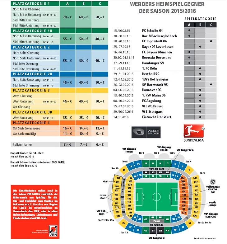 «Бременские музыканты» смогли набрать ход в концовке чемпионата и все-таки сумели сохранить прописку в Бундеслиге. Билеты на «Везерштадионе» были разделены на 3 категории. Причем стоит отметить, что матчами 3-й категории были игры против команд, которые получили право на повышение в классе в сезоне 2014/2015. Цены на билеты начинались от 12 евро на стоячую трибуну в матчах 3-й категории и заканчивались70 евро на главные матчи 1 категории на центральную трибуну, но на 10-29 ряды. На нижние ряды (1-9) билеты были значительно дешевле.