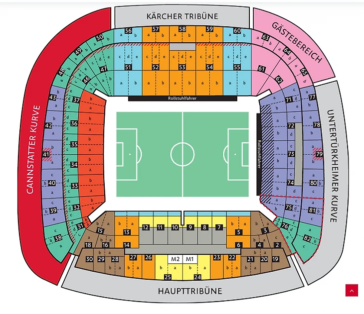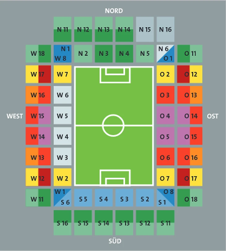 «Аугсбург» - команда из федеральной земли Бавария и многие местные шутят, что на игры их клуба съезжаются все болельщики, которым не хватает билетов на «Альянц-Арену». Правда это или нет, но стадион «Аугсбурга» в среднем заполнялся почти на 95%! Возможно, роль играют и не самые дорогие билеты. На центральную трибуны и места в середине, которые отмечены на схеме красным, билет на топовые матчи стоил всего лишь 49 евро!