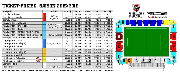 Еще одна команда из Баварии. Кроме того, еще и новичок Бундеслиги. Город, явно больше всем известный своим аутлетом, куда на шопинг съезжаются люди со всего света, теперь стал и футбольным центром первой Бундеслиги. «Ауди-Шпортпарк» является самым маленьким стадионом в элитной футбольной лиге Германии и вмещает всего 15800 человек. Также у «Ауди-Шпортпарка» есть еще одна особенность – это разные цены на билеты в онлайн магазине, билетных кассах или фан-шопе. Самые выгодные предложения – в интернете, в таблице они помечены графой «OLS».