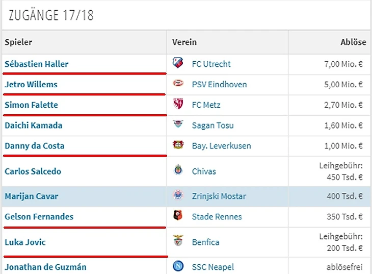 За француза Себастьяна Аллера "Утрехту" заплатили 7 млн. евро, а окончательный выкуп у "Фиорентины" трансферного листа Анте Ребича обошёлся примерно в 2 млн. Супер талант из Лиссабона - Лука Йович, наверняка будет выкуплен и обойдется Франкфурту менее 7 млн. евро. Всего 16 миллионов.