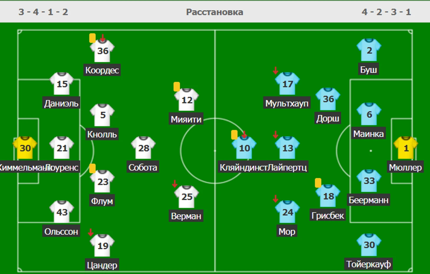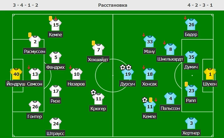 Ману на время первого тайма поменялся флангами с Кемпе. «Ауэ» же полностью отдал территорию «Дармштадту». Однако, во втором тайме Кемпе и Ману вернулись на свои фланги.