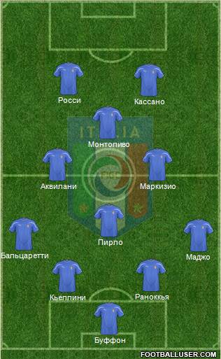 Италия: Буффон, Маджо, Кьеллини, Раноккья, Бальцаретти, Маркизио, Аквилани (Ночерино, 24), Монтоливо, Пирло, Кассано (Паццини, 65), Росси (Джовинко, 79).
