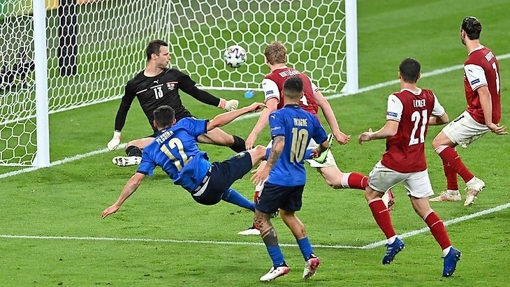 "Италия" продолжила давление на соперника, что в итоге увенчалось успехом: после неразберихи в штрафной сборной Австрии Маттео Пессина подхватил мяч и совершил плотный удар по воротам соперника, который закончился голом.