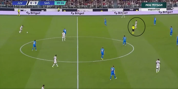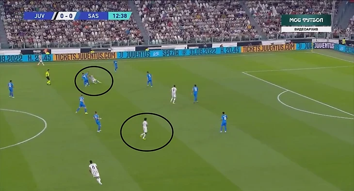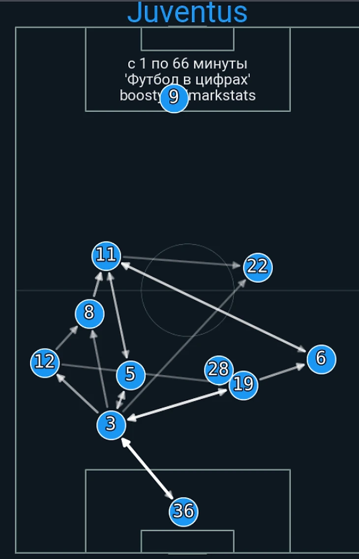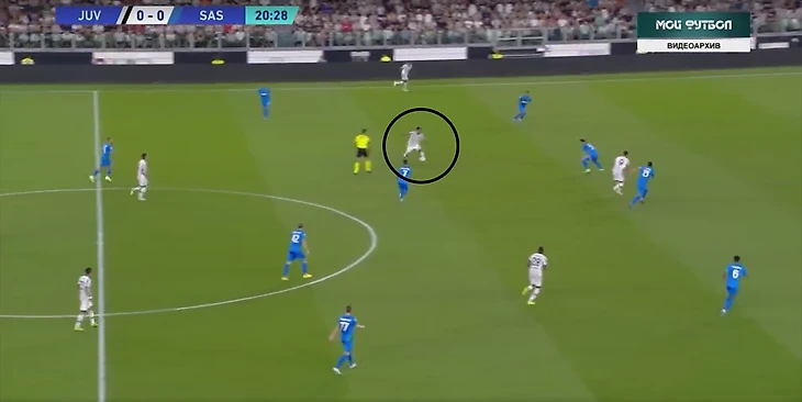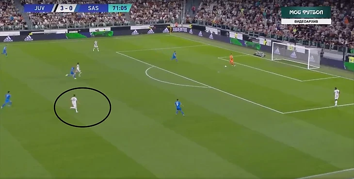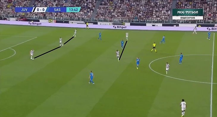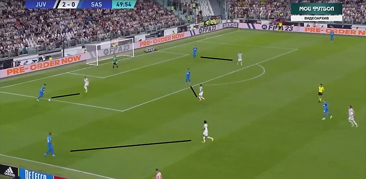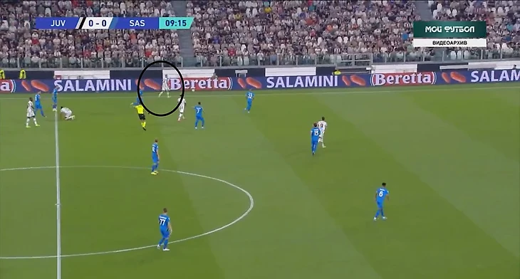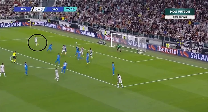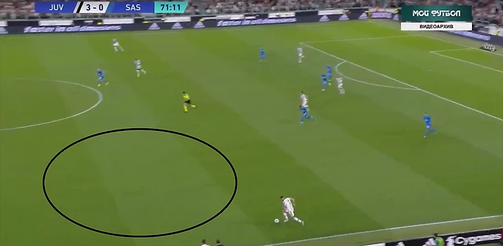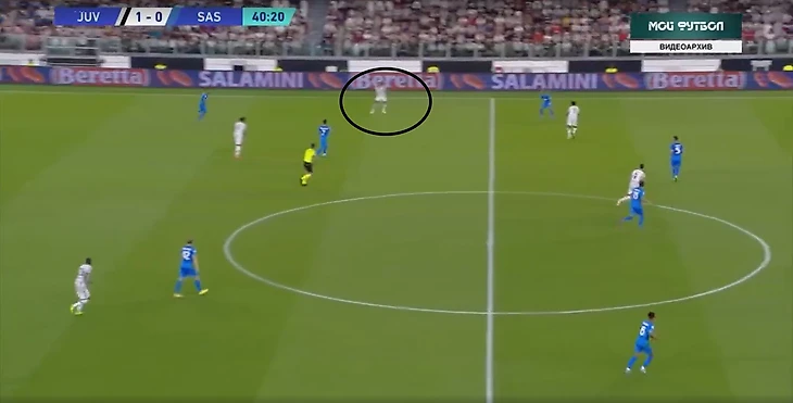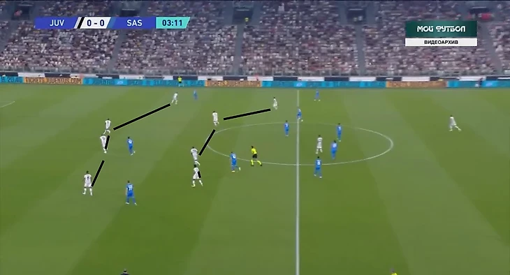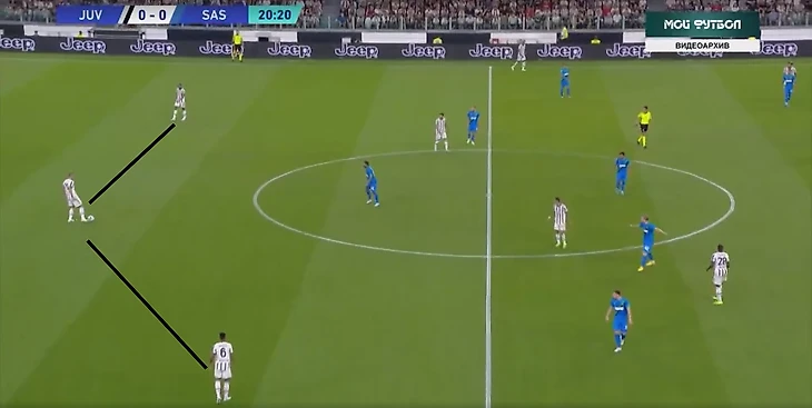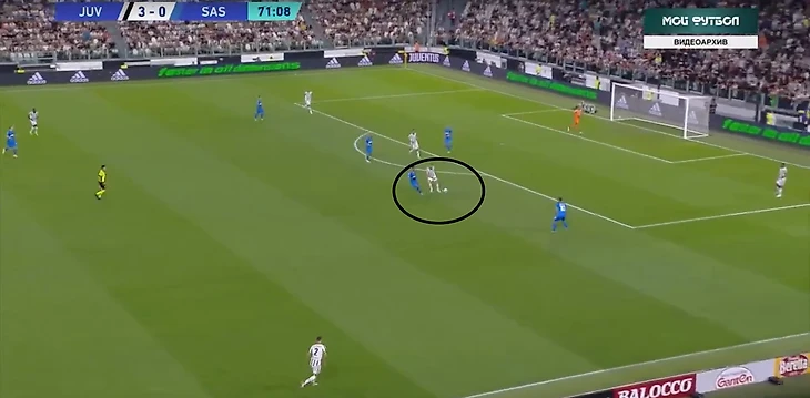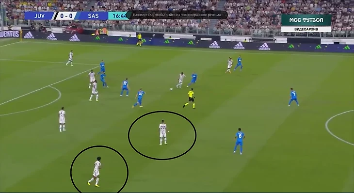 В атаке структура была иной. При построении своей атаки ситуативно создавалась тройка сзади. Это всегда происходило разными способами: опускался Локателли, либо оставался кто-то из пары Данило - Алекс Сандро. Таким образом, очень обобщенно схему Юве в атаке можно записать как 3-2-5.