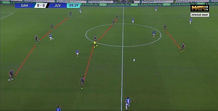 Не так было так много, что какие-то отдельные аспекты выделить трудно. Не так было в целом все в атаке и ее построении. Но начнем по порядку. Ювентус выходил на матч в схеме 4-4-2 при обороне и 3-2-5 в атаке.