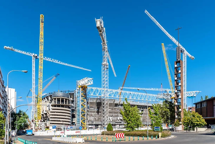 Организация строительных работ в самом сердце Мадрида — это настоящий вызов. Ограниченное пространство, транспортный коллапс, нехватка места для хранения материалов и оборудования — все это создает огромные сложности. Ежедневно использовалось более 15 кранов, включая гигантские мобильные краны с грузоподъемностью до 800 тонн, работающие в стесненных условиях. Все это происходило параллельно с проведением футбольных матчей, требующих полной подготовки стадиона для 80 000 зрителей за считанные часы.