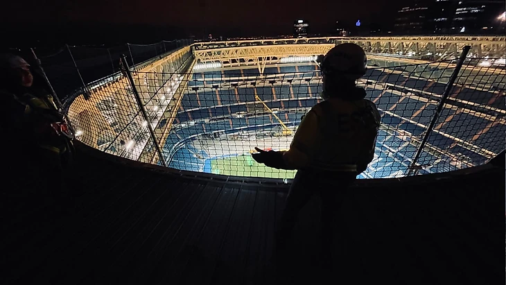 Установка двух мегаферм, каждая весом 2000 тонн и длиной 180 метров, представляла собой беспрецедентную задачу. Их невозможно собрать на земле, поэтому применялся инновационный подход, заимствованный из мостостроения. Фрагменты собираются по частям с обеих сторон стадиона, а затем соединяются наверху с невероятной точностью. Работа на высоте, ограниченное пространство и необходимость бесперебойной работы стадиона — все это усложняет задачу многократно. Даже мельчайшая ошибка сварки в несущих конструкциях, которые по весу превосходят Эйфелеву башню, может иметь катастрофические последствия. Сборка каждой фермы занимает три дня, и риск ошибки нивелируется только благодаря профессионализму и опыту специалистов.