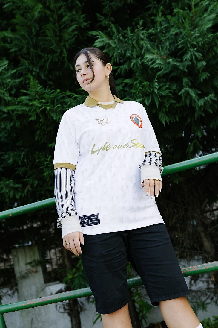 Выездная форма сохраняет некоторые характерные элементы домашней, включая логотипы Lyle & Scott и орла, но выполнена в светлых тонах с золотыми акцентами, образуя стильный контраст.