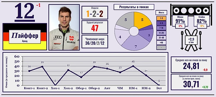 На счету немца 5 подиумов, из которых отдельно стоит выделить серебро в индивидуалке чемпионата мира и победу в масс-старте Хохфильцена. Единственное, чего не хватало в прошлом сезоне, так это стабильности.