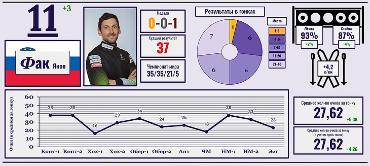 Если говорить именно про прошлый сезон, то Яков может его занести себе в актив. Все-таки удалось сделать шаг вперед, пусть и небольшой. Словенец прибавил и в скорости, и в стрельбе. Впервые за 3 года смог завоевать медаль на кубке мира.