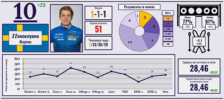 В любом случае Мартин провел для себя великолепный сезон: попал в ТОП-10 общего зачета, увез с главного старта 3 медали, в том числе личное золото, да и в целом показывал +/- ровные результаты. Год назад он об этом мог только мечтать. Ждем дальнейшего прогресса.