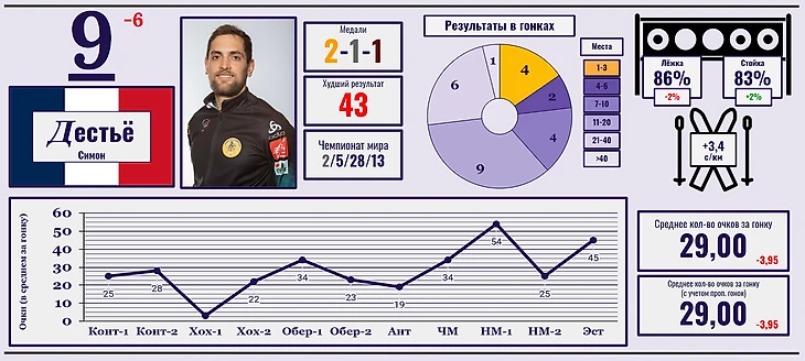 Первые четыре этапа для Симона, мягко говоря, не удались - ни одного попадания в ТОП-10 и лишь скромная 19 строчка в общем зачете по окончанию декабря. Пожалуй, Дестье был одним из главных разочарований начала сезона. Все-таки совершенно других результатов ждешь от спортсмена, в последние годы стабильно попадающего в ТОП-10 тотала. В первую очередь у него были ощутимые проблемы с ходом, также не всегда помогала стрельба.