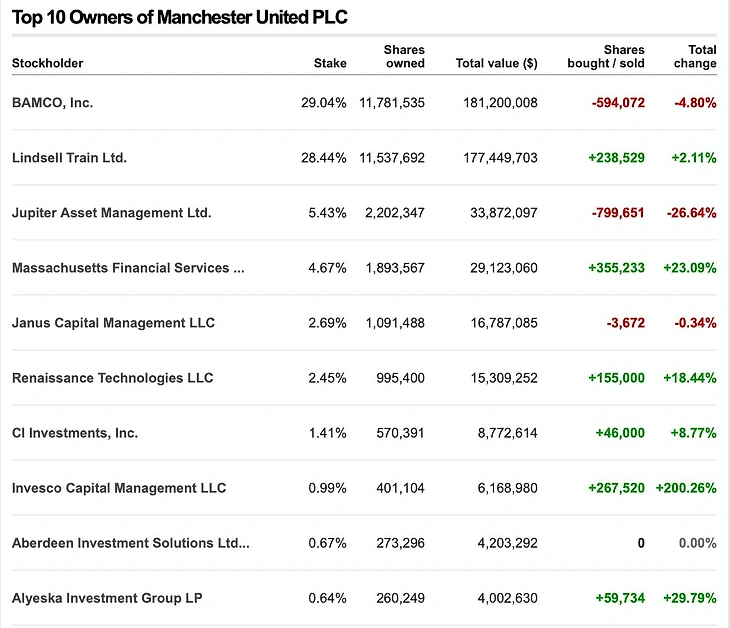 Акции манкунианского клуба котируются на бирже, а значит купить их может любой желающий, однако большая часть бумаг «красных дьяволов» сосредоточена в руках 10 компаний, 90% которых занимаются инвестициями. Эта десятка владеет 76,43% акций «МЮ». На долю всех остальных владельцев приходится меньше четверти бумаг в обращении (23,57%).