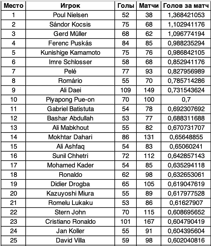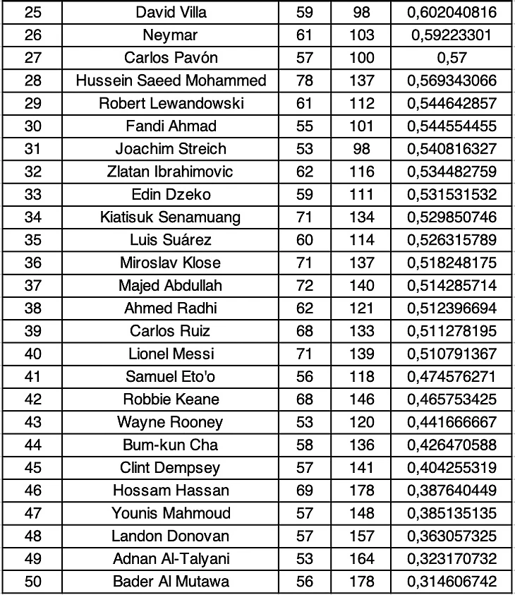 Так вот, оценивать Роналду и Даеи тоже нужно с учетом относительных величин. Достаточно просто поделить количество мячей на количество матчей, чтобы понять, кто из международных форвардов, входящих в топ-50 по забитым голам, более эффективный.