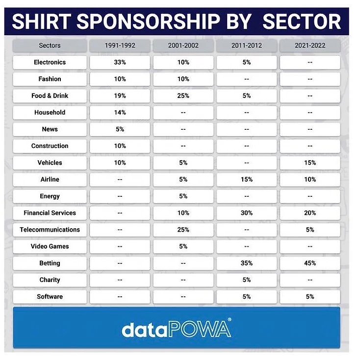 Observatoire du Sport Business соорудили таблицу и инфографику по спонсорам клубов АПЛ, начиная с самого ее старта. По ним можно легко отследить, насколько сильно изменилось положение вещей. Например, компании из сектора электроники присутствовали на 33% маек в первом розыгрыше АПЛ. В начале XXI века они остались всего на 10%. В сезоне-2021/22 на формах клубов АПЛ не осталось ни одного электроника. Примерно по такому же сценарию развивались отношения спонсоров из мира моды и еды/напитков.