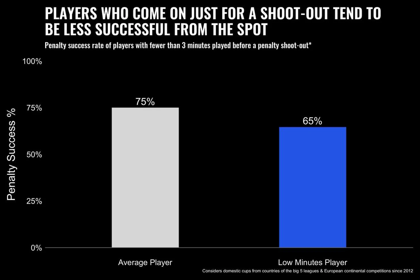 Если посмотреть на все пенальти в кубках (чемпионатов топ-5) и европейских соревнованиях, начиная с 2012 года*, станет заметно, что игроки, выходящие специально под серию (в последние три минуты – привет, Гарет Саутгейт), мажут с точки на 10% чаще тех, кто выскочил пораньше или отбегал большую часть матча.