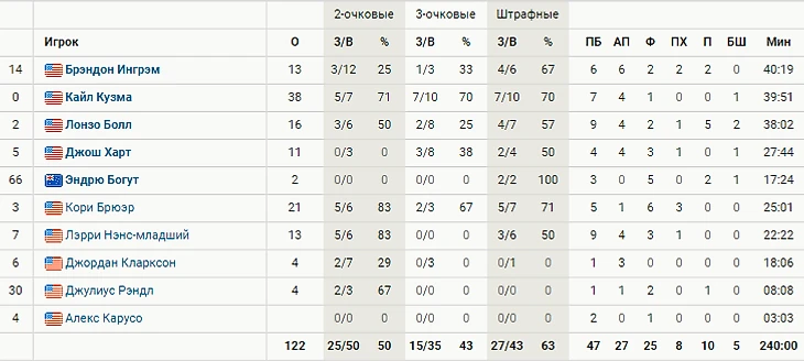 Брэндон Ингрэм: 13/6/6 + 2 перехвата, 26.7% с игры, 33.3% с дуги, 66.7% с линии, 2 потери за 40 минут. Проходы под кольцо сегодн не особо удавались, это было компенсировано шестью передачами, неплохо разыгрывал мяч и отрабатывал в защите;