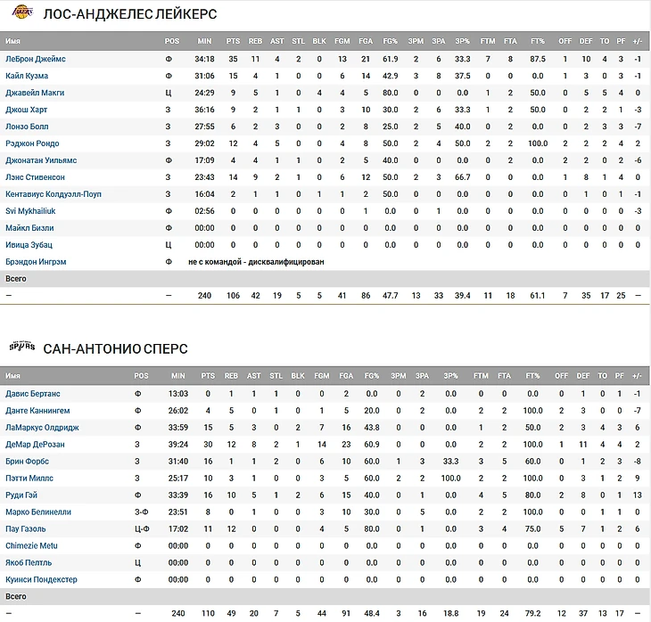 САС быстро двигали мяч, вынуждали Лейкерс фолить (6 раз), доминировали в краске связкой Ламаркус Газолдридж. Забавно, что за всю игру шпоры попали всего 3(!) раза с дуги, и им этого вполне хватило