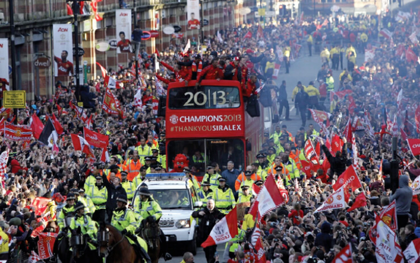 Мы не устраивали Скоулзи официальных прощаний. Он просто не хотел ничего такого. На следующий день был назначен парад в нашу честь. На то, чтобы составить план поездки, было предостаточно времени, ведь мы победили в Премьер-Лиге за две недели до этого. Мы собрались у «Олд Траффорд» и погрузились в автобус. Наши близкие собрались нас проводить. За два часа парада на двухэтажном автобусе мы объехали практически весь город. Когда мы добрались до Динсгейта, я осип, ведь всю дорогу праздновал и распевал песни во весь голос. Незабываемо. Там мы развернулись и поехали обратно. У меня на шее висел телефон с камерой — так я хотел запечатлеть каждую секунду этого памятного дня. Пока мы поворачивали, я увидел зрелище, которое меня поразило. У одного из пяти- или шестиэтажного здания стояли леса. Чтобы туда никто не проник, строители поставили перед ними заграждение, но кто-то его убрал, и на каждом миллиметре конструкции стояли наши болельщики. Они активно нас приветствовали и просто сходили с ума от радости. Это потрясающее зрелище в очередной раз напомнило мне, как важен «Манчестер Юнайтед» для множества болельщиков по всему миру. Я никогда не забуду картину, которая открылась мне, когда мы подъехали к Альберт-Сквер. На сцене играли The Courteneers, а вся площадь была забита нашими болельщиками. Децибелы зашкаливали. Все ждали нашего появления. Никто из ребят в автобусе не мог поверить своим глазам. Неплохая компенсация за отсутствие парада после нашей победы в финале Лиги Чемпионов в Москве!