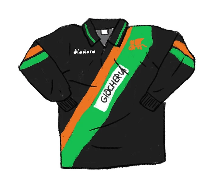По-итальянски «приподнятый» - это рубашки с широкой центральной полосой по середине, которые прославил амстердамский «Аякс». Футболка «Удинезе» конца 1970-х годов от итальянского бренда «Pouchain» - классический образец этого стиля