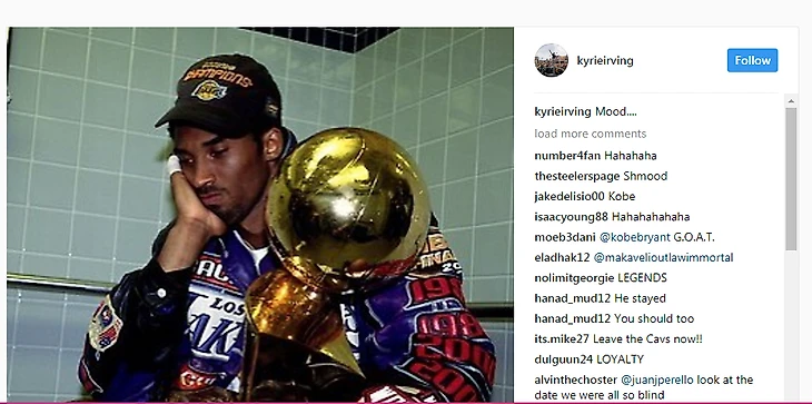 - Кайри неоднократно говорил, что его кумиром является Кобе Брайант. Сам Кобе говорил, что Кайри и Уэстбрук - его фавориты и "наследники" после его ухода и советовал Кайри в прошлом году "быть самим собой". Кобе, избавившись от Шака, добился МВП лиги, и в конечном итоге самостоятельно взял перстни и достиг величия.