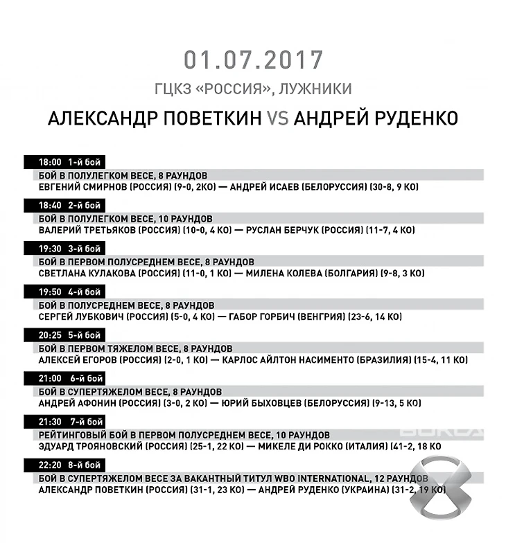 21.50. Состав судейской бригады на бой Поветкина и Руденко ранее утвердила Всемирная боксерская организация (WBO).