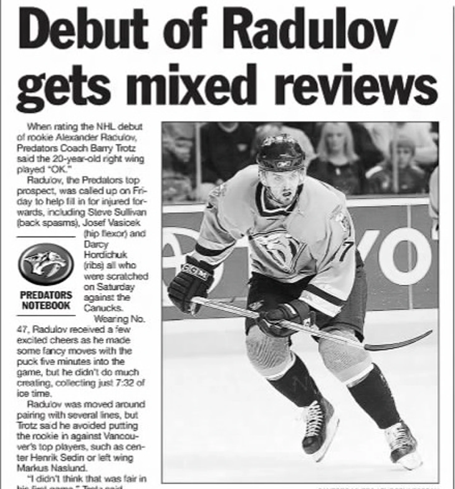 «Я бы мог давать Радулову 15 минут игрового времени, но тогда мне пришлось бы урезать время Карии, Эрата, Дюмонта или Салливана. Кто из них должен страдать? Радулову нужно набраться терпения. Его время придет» (Барри Троц, The Tennessean, декабрь 2006).