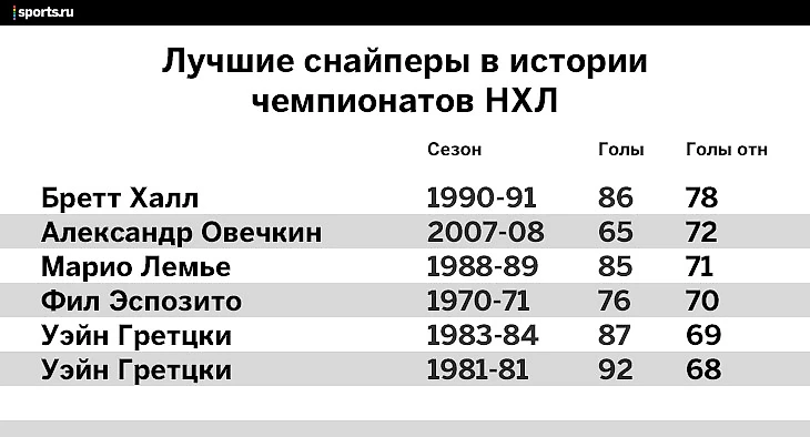 Прежде чем вы полезете в Википедию ловить меня на ошибке, скажу, что семь раз лучшим снайпером НХЛ также становился Бобби Халл, и его победы уложились в 12 лет. «Морис Ришар Трофи» тогда не существовало, но голы подсчитывались исправно, и достижение отца большого хоккейного семейства нужно уважать. А вот считать ли его ориентиром для снайперов следующих поколений, решать вам. Халл играл в лиге, состоявшей из шести команд, и после расширения НХЛ он был лучшим снайпером только дважды. Хоккеисты тогда намного меньше летали, в клубах не было европейцев и почти не было американцев. Голкиперы уступали нынешним в росте (на 10-12 см ниже) и не перекрывали все ворота одной только ловушкой.