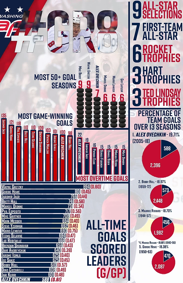 Тот же TSN в январе прошлого года подсчитал среднее количество голов для легенд НХЛ с поправкой на результативность в разные эпохи. У Овечкина оно было самым высоким – 0,73. Халл-старший не попал даже в десятку. По той же причине сезонные рекорды Гретцки не впечатляют так, как в 80-х. Перерасчет Sportsnet показал, что 65 голов хоккеиста «Вашингтона» в регулярке-07/08 даже круче, чем 92 шайбы Уэйна в 1982-м. Тогда забивали в полтора раза чаще. Перед Матчем звезд пиар-служба «Кэпиталс» выдала мощную подборку статистики по Овечкину, и выяснилось, что ни одна команда в истории не зависела от голов Александра, как «Вашингтон» (19,7 % всех заброшенных шайб с сезона-2005/06).