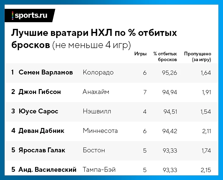 В предсезонке три вратаря «лавин» играли поровну и одинаково неважно, что наводило на неприятные мысли о будущем самого дорогого из них (зарплата Варламова – 5,5 млн в год). Но первые дни регулярки Семен проводит надежнее Грубауэра или Францоуза. Вообще надежнее всех в НХЛ.