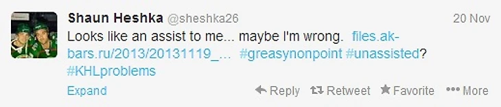 Как главные арбитры матча Владимир Букин и Александр Сергеев, а также лайнсмены Андрей Матюша и Роман Меньших, могли не заметить полезного действия Хешки, не понятно. Была затяжная атака с несколькими передачами, команды не отвлекали судей толкотней на пятаке или пересменкой. Через несколько дней защитник «Ак Барса» пожаловался в твиттере на то, что ему не приписали результативный пас в игре с «Адмиралом», но потом удалил сообщение. Эпизод менее очевидный, но тоже не бесспорный. Надеюсь, КХЛ не будет штрафовать Хешку на 30 тысяч рублей за критику арбитров.