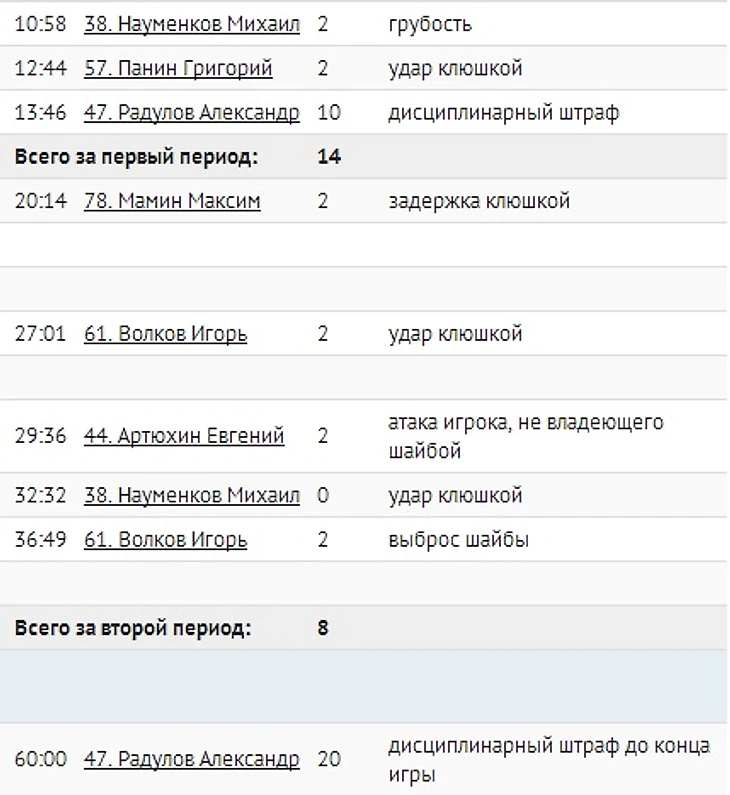 Странно, но согласно официальному протоколу на официальном же сайте КХЛ у Радулова значатся 10-минутный и 20-минутный штрафы, что карается дисквалификацией.