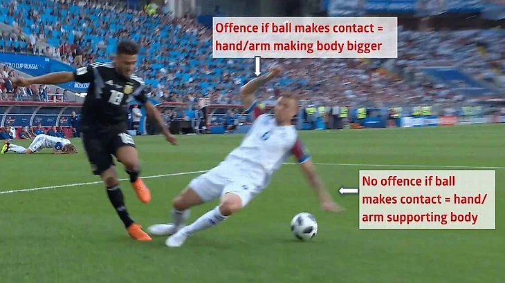 Одним из таких факторов, который должен учитывать арбитр, является то, касается ли рука или предплечье мяча в момент, когда игрок падает и использует её как опору для тела. То есть игроку не обязательно убирать руку, чтобы не нарушить правило, и при этом падать плашмя — он имеет право использовать руку, чтобы смягчить падение.