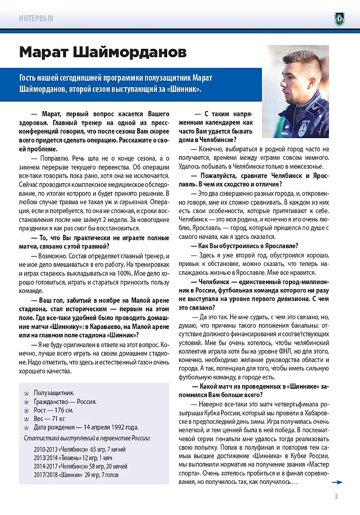 В этом повествовании Марат уже пару раз появлялся. Теперь остановимся на его истории более подробно. В мае 2014 года 22-летний Марат Шайморданов в составе «Тюмени» оформил выход в ФНЛ. В турнире рангом выше тюменцы в своем составе челябинца не видели - и он вернулся домой. И вот - спустя три года - Шайморданов наконец получил свой шанс. Съездил летом на просмотр в «Шинник» - и приглянулся ярославцам. Наш вингер подписал 2-летний контракт с 8-й командой Первенства ФНЛ.