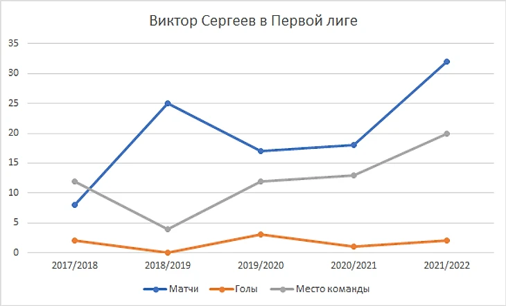 Как видно на графике - количество сыгранных матчей у Виктора увеличивалось, но при этом команды занимали места все ниже. В плане результативности при этом все стабильно.