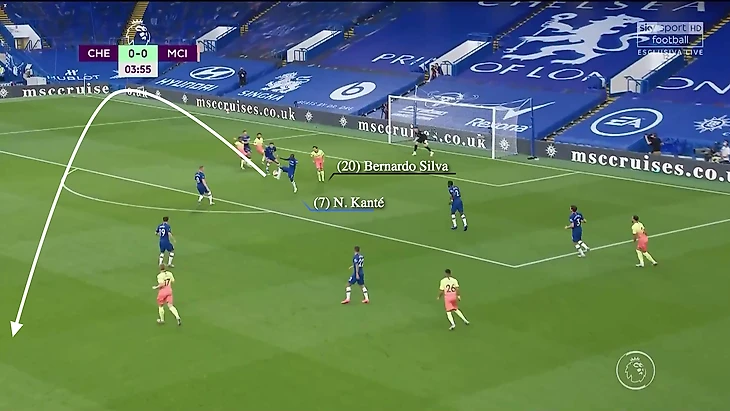 На первых минутах Канте персонально играет с Бернарду Силвой, который выполнял функции «ложной девятки». Н’Голо не оставляет своего игрока даже в штрафной – «Челси» в подобных моментах выдерживал линию обороны из 5 человек. Это заметно снижало опасность: в данном случае на кросс Мареза откликнуться некому.