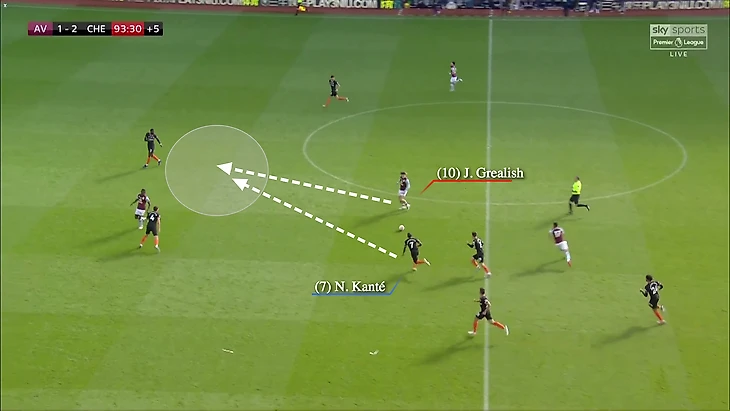 В добавленное ко второму тайму время тому был отличный пример. Рис Джеймс ошибся и потерял мяч на половине соперника, за счет чего Грилиш чуть ли не впервые за матч оказался в позиции, где он ближе к воротам Кепы, чем Канте. Капитан «Астон Виллы» получает мяч и начинает его продвигать по свободному коридору.