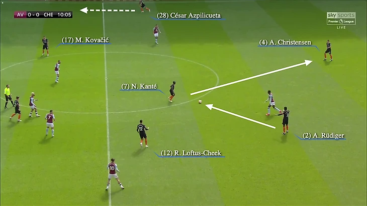 Да, пас на Кристенсена – не катастрофа, ведь «Челси» сохранил мяч, а у датчанина есть масса вариантов для продолжения позиционной атаки. Но передача Канте не заставила «Виллу» реагировать на ситуацию. А могла – острый пас на Ковачича, Аспиликуэту или Рубена Лофтуса-Чика заставил был команду соперника быстро реагировать на изменение ситуации.