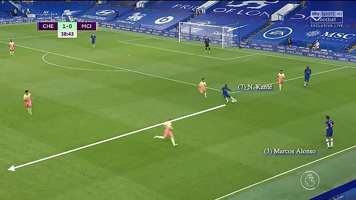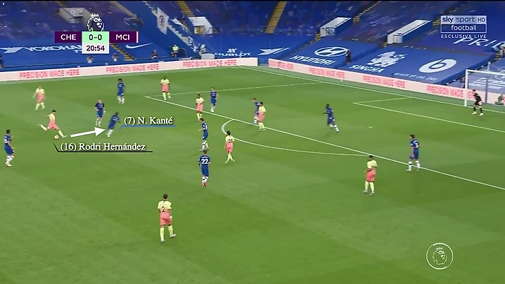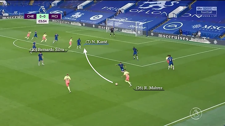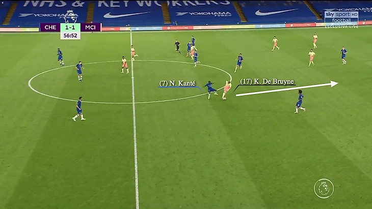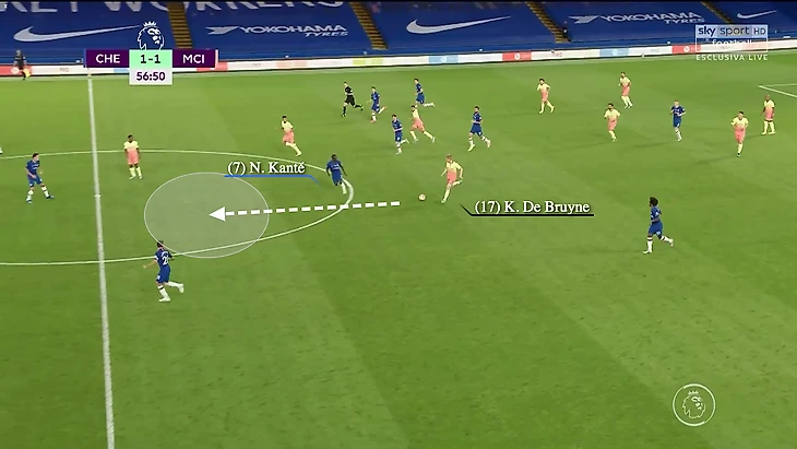 Однако Канте прессинговал Кевина таким образом, что ни Марезу, ни Стерлингу выполнить точную передачу вперед бельгиец не мог. Н’Голо затормозил движение Де Брейне и, выполняя отбор, вынудил звезду «Манчестер Сити» отдать передачу назад.