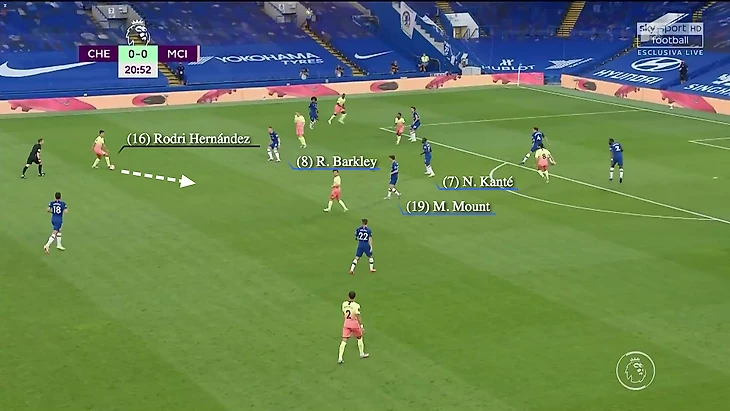 В середине первого тайма неожиданно много пространства получает Родри и начинает двигаться вперед. Маунт и Баркли находятся ближе к испанцу, однако уже опекают Кевина Де Брейне и Бернарду Силву.