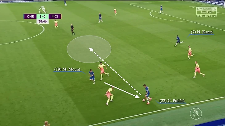 Маунт быстро отдал мяч Пулишичу, которого ждала редкая роскошь этого матча – у американца было сразу несколько вариантов продолжения атаки: разыграть с Маунтом на фланге, отдать поперек на Канте или прорваться на дриблинге самому. Кристиан выбрал третий вариант, что привело к опасной атаке «Челси».
