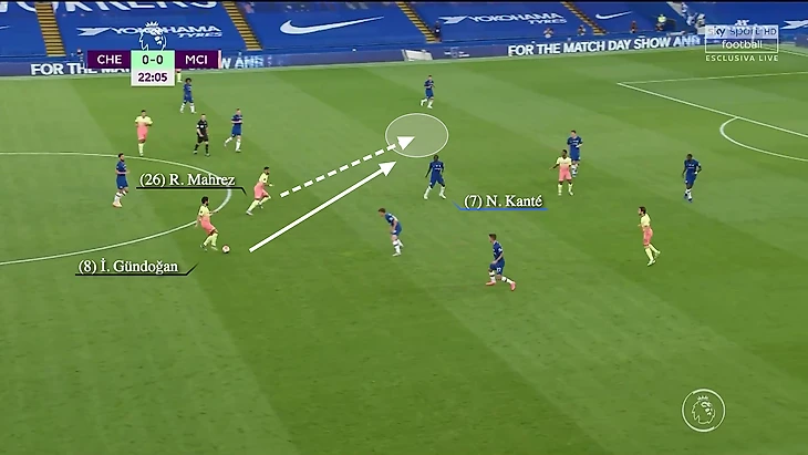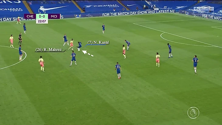 Двумя минутами спустя Канте стоит лицом к владеющему мячом Гюндогану, периферическим зрением контролируя движение Рияда Мареза.