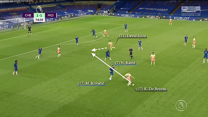 Это был не единственный момент в матче, когда Канте переиграл Де Брейне. На 75 минуте Канте всем видом показывал, что опекает Стерлинга и готов перехватить пас на англичанина. В этот момент за его спиной пробегал Давид Сильва.